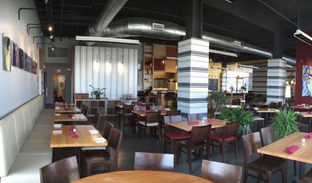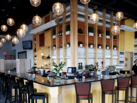 The fit-out includes dining areas, bar design, kitchen and restroom layouts. The interior design concept follows through on the industrial loft aesthetic of the entire 1500 Condo building in which it is housed. Open spaces with tall exposed-structure ceilings, pigmented concrete floors and exposed mechanical ductwork provided the backdrop for the restaurant. Strong vertical and horizontal lines, industrial lighting, bold foiled stripes, color blocks of mustard yellow and wine red, and a variety of wood tones are juxtaposed to create a dynamic urban vibe. The stylized back bar anchors the space with its functional collage of colors, shapes, surfaces and finishes. A grouping of clear glass globe pendant light fixtures hung over the bar at varying heights accentuates the custom designed bar.